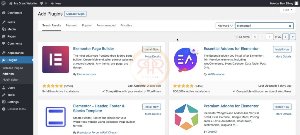 Dimenu Plugins > Add New dan gunakan pencarian di kanan atas untuk mencari “elementor”.